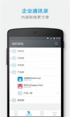 3.更方便高级管理层管理内部员工和工作文件,组织结构使找人不再困难,企业通讯簿就在你手中。