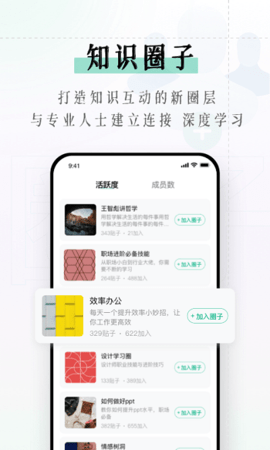 圈子功能,创建一个新的知识互动圈,职业、效率、学习、情感等您感兴趣的圈,加入您最喜欢的圈子,并与知名人士建立联系,深入讨论和学习,不断研究和成长