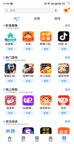 1.主界面为用户提供四个类别:首页、热门、游戏和新类别。