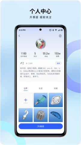 1、刷3D模型,学习和分享优秀的产品设计和行业知识,上传自己的3D模型,如:跑车、飞机、机器人、娃娃等