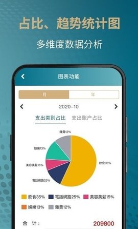 3、以图形方式呈现消费构成,通过趋势图和分类饼图,清楚地看到每周、每月的个人开支。