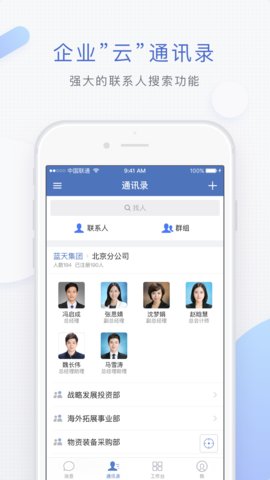3、基于手机上组织的“云”通讯录,可以快速检索联系人,一键组成工作小组,实现跨级别即时通信。