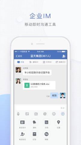 蓝信+app是一款移动办公软件,该软件具有即时通讯、名片库、工作组、文件共享和存储、电话会议、数据报告和统计等功能服务,可以更好的帮助移动协同办公,同时支持文字,语音,表情,地理位置,图片,文档,音频,视频等类型的信息,非常便捷。