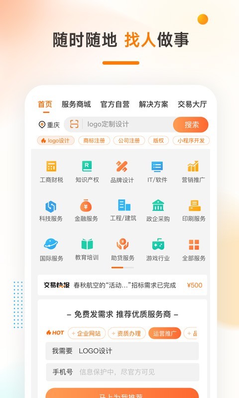 猪八戒app是一款非常好用的企业管理服务app,服务的内容非常多样,满足企业的各种需求,想要设计公司logo、装修公司还是需要商标注册都可以下载这款应用解决,交易过程非常迅速方便,如果你是商家也可以使用这款软件赚钱,完成其他企业的需求即可。