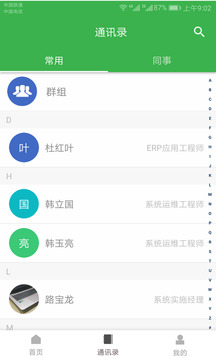 2.可以打开通讯录找到同一家公司的同事,还可以在线就工作问题直接与同事交流。