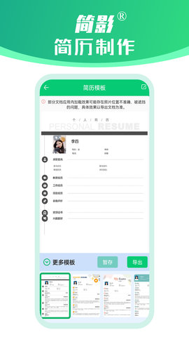 简影简历制作内置海量的简历模板,可以让用户自由使用,进入自己的生活体验,系统会自动帮你进行生产,成品可以保存,方便你在网上找工作发送到人员,将简历生产非常简单,申请会帮你自动生成,省去了很多麻烦。