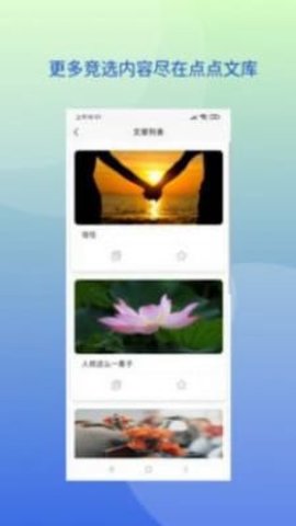 点点文库app是一款非常有用的文案软件,点点文库app为你带来全方位高质量的文案,你可以直接搜索找到你需要的副本,免费提供各种文案模板使用,非常方便用户日常生活使用,欢迎下载!