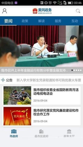 2、黄冈政务APP主要包括新闻、政策、解读、效劳、互动等栏目。