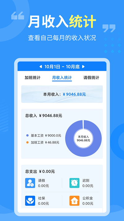 2、轻松记录加班补贴、全勤、休假、社保、公积金、调休等信息,自动生成数据统计。