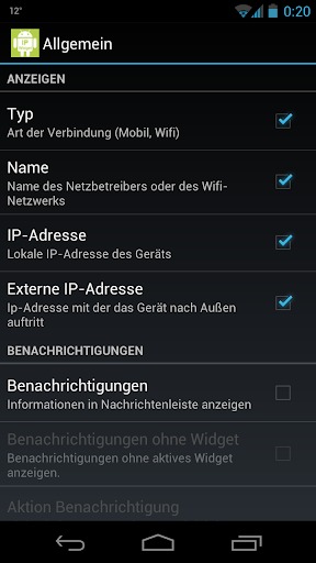 12、点击小部件/通知时的动作可配置(打开wifi设置,切换wifi[开/关],打开IP小部件设置,手动刷新小部件内容);
