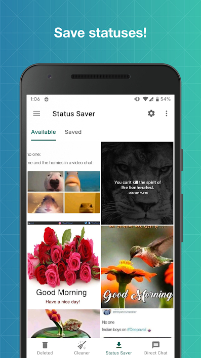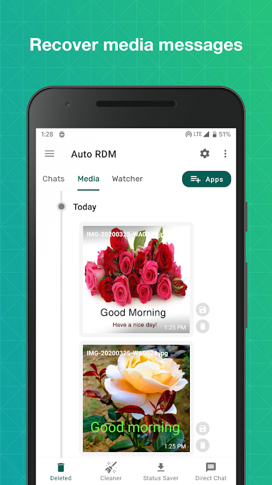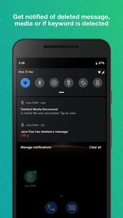 自动RDM是一个实用的应用程序,将帮助你恢复删除的消息扫描你的通知。有了这个应用程序,你不仅可以恢复文本信息,还可以恢复任何媒体附件(图片、视频、语音笔记、音频、动画gif和贴图)!您还可以下载状态和直接消息。