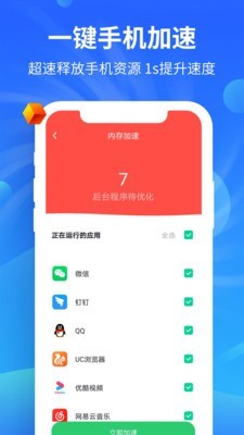 2.一键释放手机后台应用,提高手机运行速度。