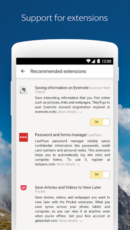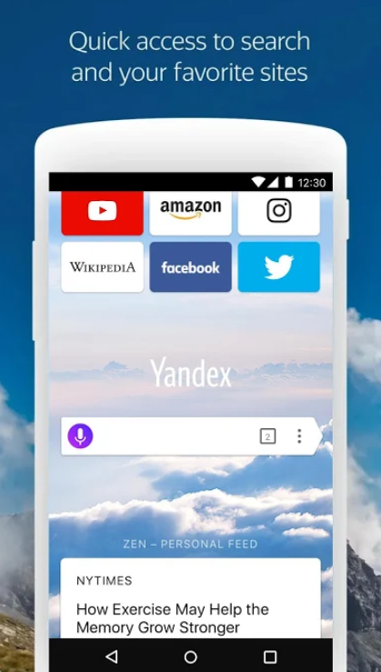 Yandex浏览器一款时尚安全的导航应用,语音搜索和数据压缩。根据你的兴趣浏览来自互联网的故事、新闻和视频,并以禅的形式呈现。减少您的数据使用,并加快加载网页和图像时,您的互联网连接速度缓慢与浏览器的自动涡轮模式。