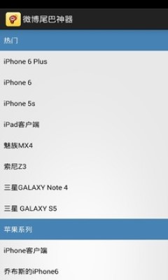 新浪微博iPhone尾巴 for android 安卓手机版,附件中还有一个:自定义尾巴微博.apk,装上以后,你想用在微博上显示什么手机,自己装吧,反正也是骗人的。有需要的用户可以点击yn下载站了解。更多社交软件神器推荐:微商尾巴神器下载。