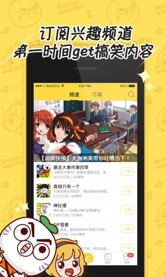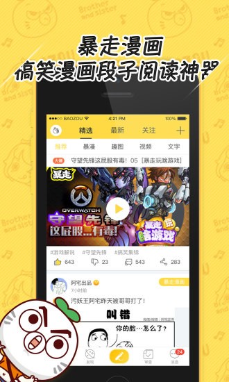 暴走漫画是一款手机阅读漫画软件,暴走漫画让你每天自嗨爆笑搞不定,分分钟更新内容,各种无节操、搞笑、无厘头的漫画、段子、图片还有神回复、神补刀,让你在无论是蹲坑、吃饭、洗澡、等车、排队都是打发时间的爆笑神器,每天都能自嗨拒绝无聊日子,就用暴走漫画。