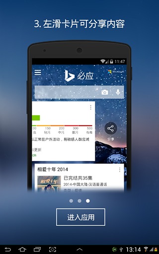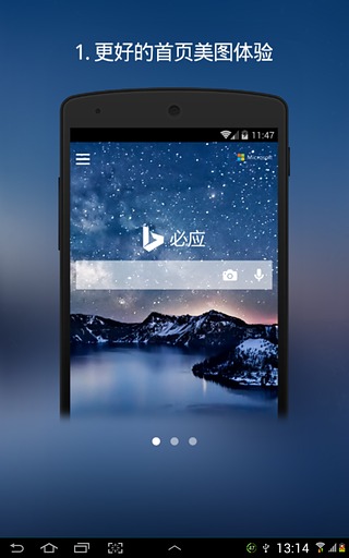 1.在主界面可以快速了解网络最新热点、附近的天气及地图,以及您感兴趣的其他信息。一切尽在必应HD主界面