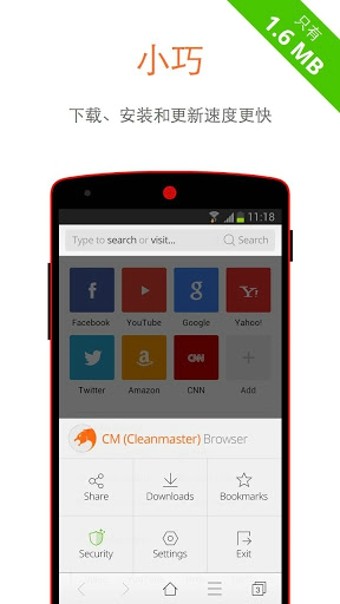 CM Browser 是由猎豹移动公司推出猎豹浏览器国际版,该软件适于安卓手机用户下载安装,猎豹浏览器国际版是一款超轻量级的手机浏览器,小巧轻便的设计,比极速版还要小,快速安全是它的口号,可以保护您免受恶意威胁,仍然让你快速的浏览速度。上手感觉确实比较简洁,速度很快,而且这么好的功能只有1.5M。更多优质浏览器推荐:阿猫浏览器。