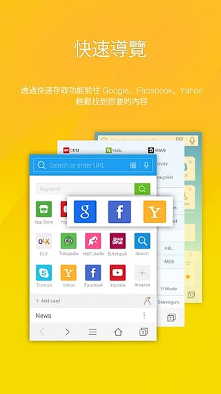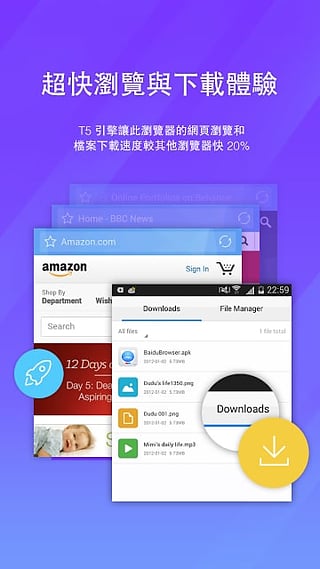 百度浏览器提供轻松快速且安全的存取,让您尽情地浏览网路。「我的最爱」、「推荐」以及「探索」分为 3 个画面显示。只要点选一下萤幕或滑动一下手指,就可享受快速浏览 (采用 T5 引擎)、趣味影片,以及新闻等更多功能。透过其独特的全球认证系统,百度浏览器得以识别恶意网站,确保您拥有安全且快速的浏览与下载体验。