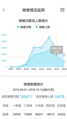 1.检查我区成绩和以往平均成绩的折线统计图,检查各年级、2265所学校和班级使用数据的折线统计图。