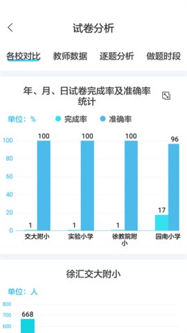 3.检查试卷完成情况、参加试卷的学校排名、学校知识点掌握情况排名和教师得分排名。