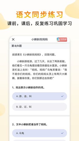 你可以选择你需要学习的年级,所有科目都有相关的同步辅导,提供的教材与课堂同步,有详细的讲解和多样化的练习,帮助孩子高效、智能地提高分数,该平台还提供专业的智能口语练习和有趣的角色扮演,实时提高学生的口语发音水平。
