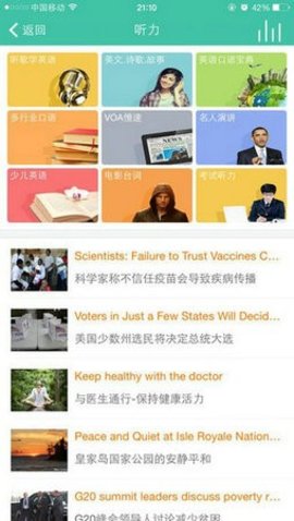双语文章、双语新闻快报、考试信息、英语小说等英语话题。