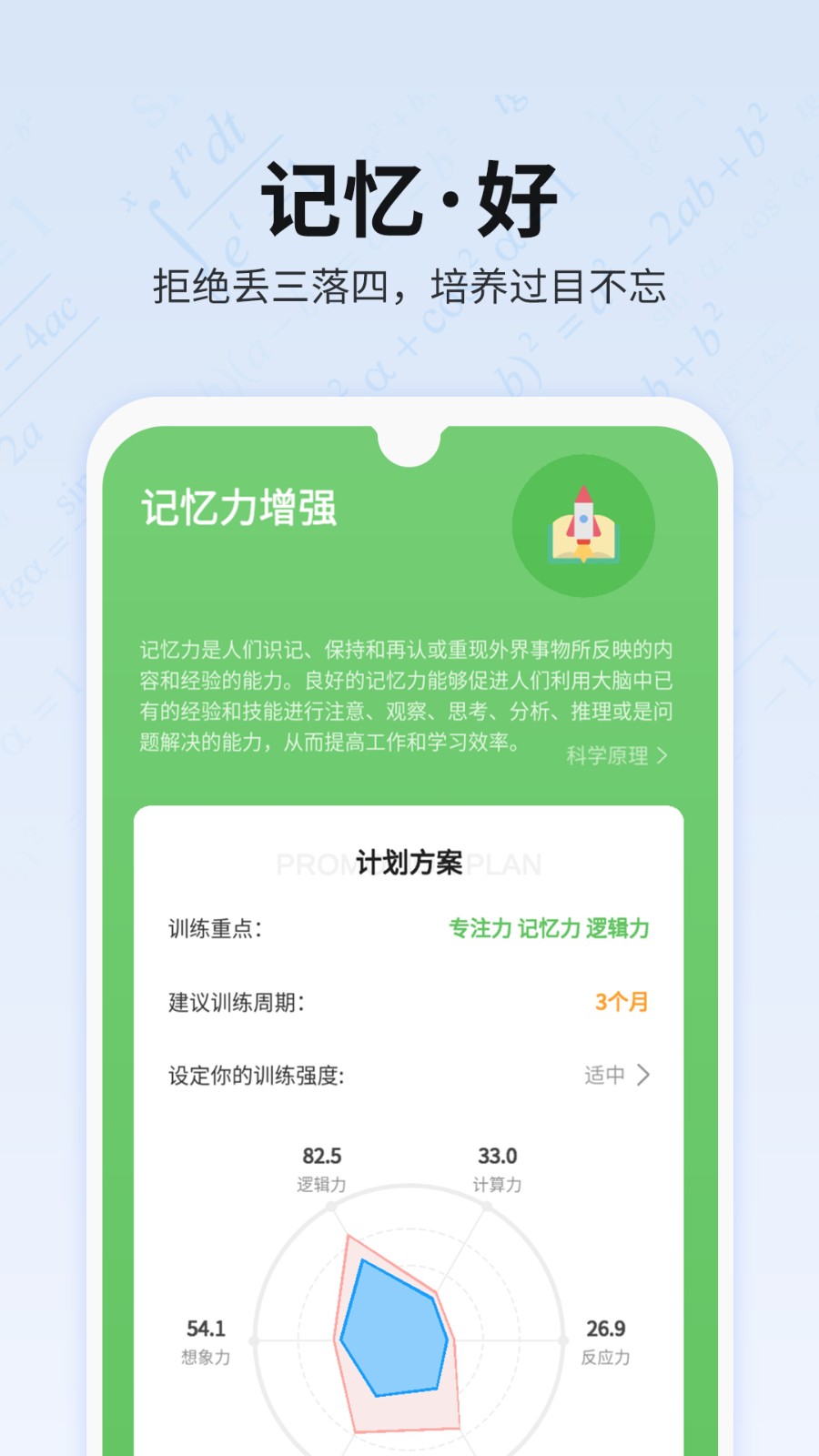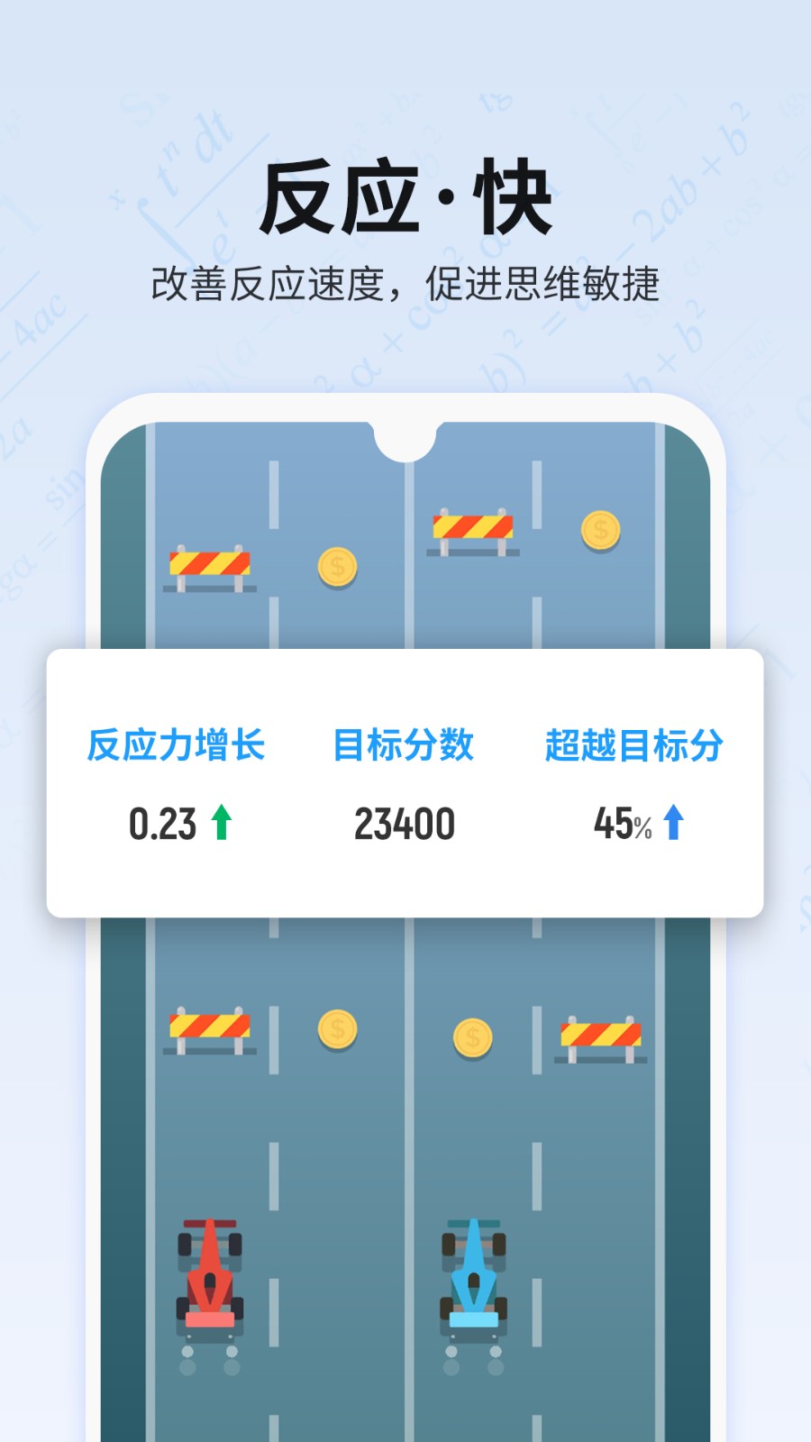 1.专门采用连续游戏设计,通过单人挑战、实时比赛的游戏模式,为用户提供多脑能力游戏训练内容