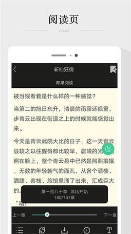 2.在阅读时使用夜间模式保护您的眼睛,强大的阅读功能,如多重翻页效果,文字大小调整,阅读背景变化,阅读亮度调整,进度跳跃,目录书签,提供贴心的阅读体验。