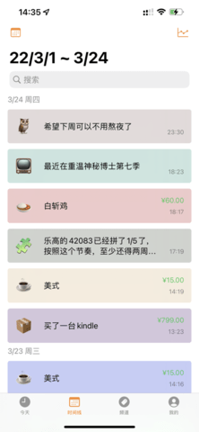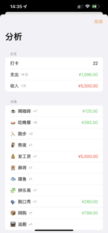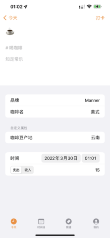 2.同时,你可以在打卡时有条理地记录一些属性,比如你早上喝的咖啡豆的来源和酸度,无论你是在下午玩游戏,塞尔达还是马里奥;同时,该应用程序还提供了一个简单的计费功能。