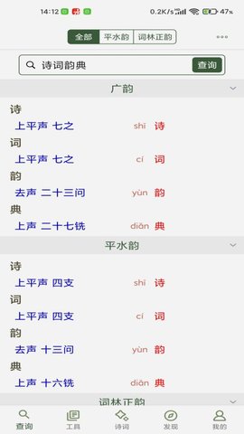 1、诗歌押韵词典包括平水韵和词林正韵两本押韵书,具有很强的查询能力