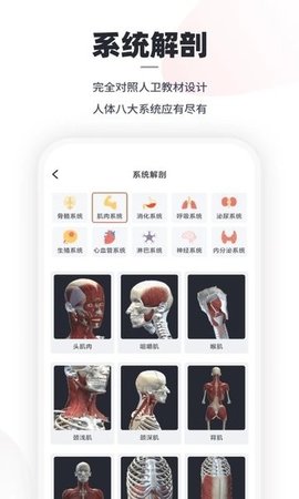 4.包括运动、神经、循环、内分泌、骨骼、消化、泌尿、生殖等系统及其细分部分;总共包括数百种系统分类,以方便用户通过单击直接访问特定的人体部位。