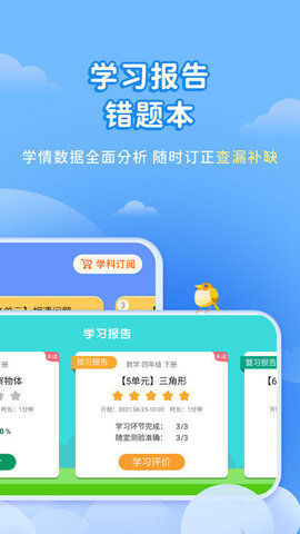 3、语文和数学两大学科,校外学习环节(预习/复习)和“指导-教学-学习-测试-实践-评价”的完整学习过程,帮助4、学生培养自主学习的能力和习惯。