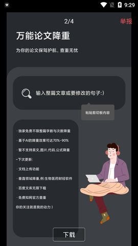 万能论文降重app最新版是专为大学生设计的论文查重软件。为大学生提供专业服务,护送论文的引用,帮助大学生有效降低论文的重复率,通过论文的复检,轻松解决大学生的一些问题和烦恼。