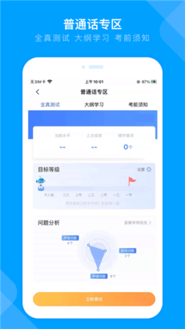 2、语音诊断:试题参照《国家普通话水平测试大纲》,包括单音节词、多音节词、阅读段落和命题口语,系统会生成水平测试报告,诊断后,用户可以通过报告了解自己的普通话水平和语音问题