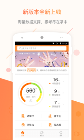 2. 自愿申请:高考数据来源于官方机构和大学,权威、准确、及时。累计数据量已达数百万,志愿申请主要包括:真假大学、评估整理大学、查专业、查校、海外大学等大学咨询服务,总有一所大学适合你