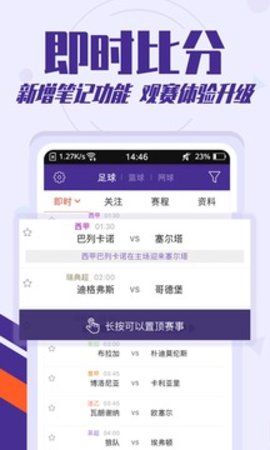 捷报比分拥有全面的体育信息,使用非常方便,客户可以随时随地在线查询精彩的比赛情况。有一个丰富的足球数据和篮球数据数据库:欧洲杯、欧洲五大联赛、冠军联赛、中超联赛、亚洲冠军联赛和其他赛事。让用户随时随地观看足球和篮球比赛等体育赛事的得分情况。