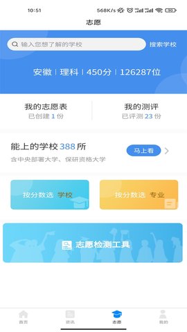 1、在这个APP里有每个大学的详细介绍,你可以在里面输入你的个人分数,它会为考生匹配大量的大学