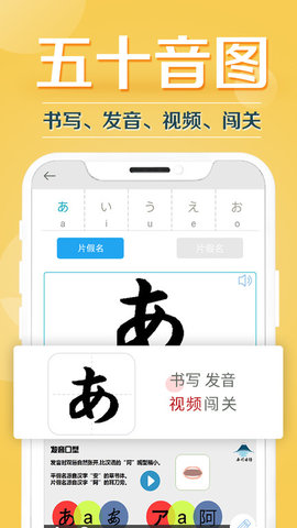 1、假名学习:每一个假名都配有真人发音和专业老师讲解的视频