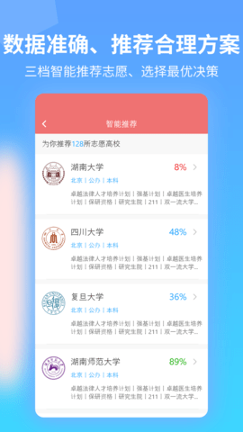 1、利用核心算法提供匹配高校和专业供考试,用户可以了解权威推荐更多高校,预测自己的定位