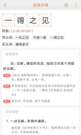 它是一款正版、免费、离线的成语搜索软件。它整合了20本专业词典,包含近40000个习语。它为用户提供了详细的定义。它可以满足不同用户的单词搜索需求。它提供了一种方便的关键字查询方法,提供了详细易懂的习语分析,并显示了详细易懂的习语分析,掌握习语的来源,并帮助用户回答一些特别罕见的习语。