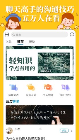 轻知识官方版是是一款帮助人更容易说话的软件。它通过沟通百科全书让用户体验全面优质的内容。通过课程帮助学习者提高交流能力,解决困扰个人问题。喜欢的用户们快来下载体验。