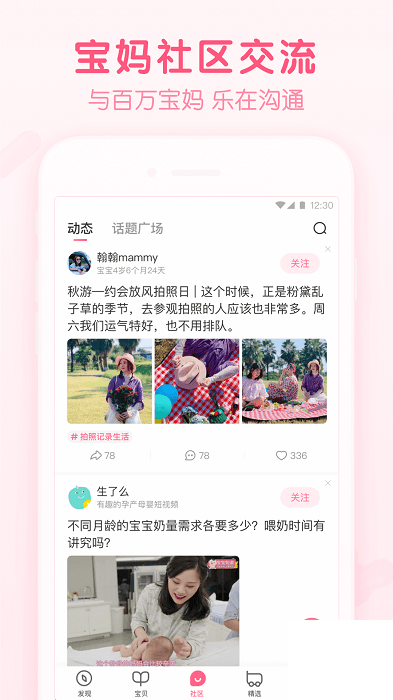 轻松搭建丰富多彩的话题世界,从孕期琐事到萌娃趣事,再到育儿体验,充分满足妈妈们的交流需求,每一个小话题都蕴含着妈妈们的大世界