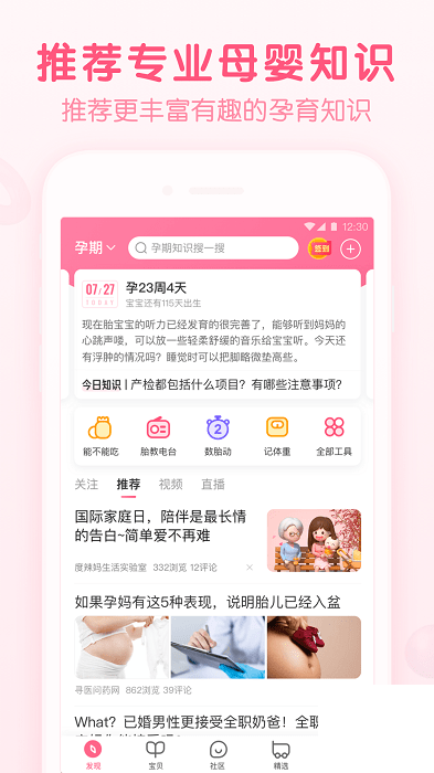 4、定制内容&个性化推荐,使用强大的AI技术,每天都可以收到平台制作的定制内容。妈妈们可以设置自己的怀孕状态,个性化的内容推荐更准确,更符合妈妈的需求