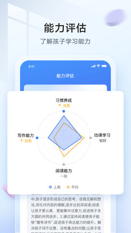 支持查看绑定学生的综合能力水平对孩子的写作能力、阅读能力、作业学习、习惯养成等进行科学分析和评价科学指导,提供培训建议