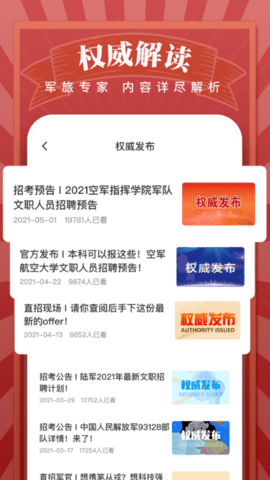 3、为广大考生提供一套完整的军民注册信息和各岗位招聘动态,并对政策法规进行详细解读。为考生提供合理的备考建议