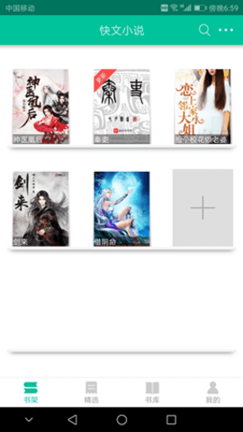 快文小说应用书架包含自备图书、最近读过的图书等。