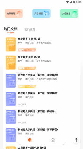 3、图片扫描搜索功能:您可以拍摄单个主题进行搜索,也可以拍摄教科书后面的条形码或直接输入教科书标题,获得整本书的练习答案。