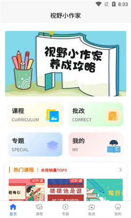 视野小作家是一个便捷的服务平台。为用户提供丰富的教学课程,用户能学习到丰富实用的写作技巧。网上的课程非常丰富,你不用出门就可以在网上学习作文。使用户可以更好地锻炼写作方式。用有趣有效的课程和科学系统的训练方法,培养学生的文学兴趣,帮助孩子学习如何优秀的写出佳作。