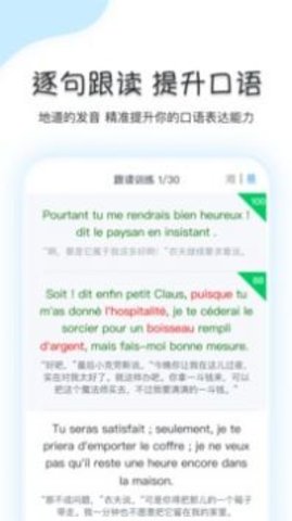 1、离线收听:离线收听省流量,高速批量下载无限制,随时随地轻松学法语;