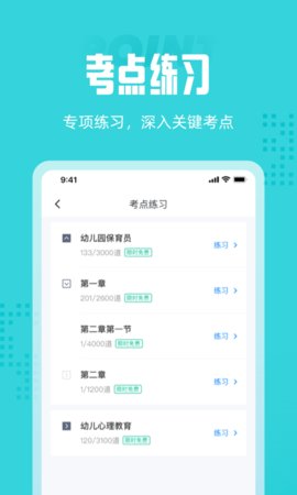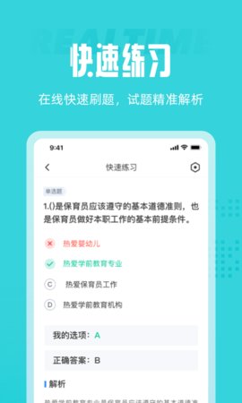 3、保育员题库包含考场练习、全国通用试卷和区域试卷模拟练习,以及根据考试固定比例随机选择题的真实考场